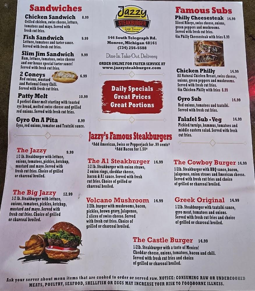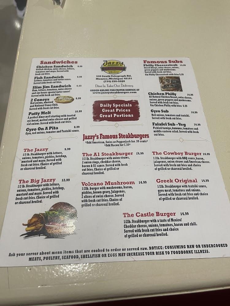 Welcome to Jazzy Steakburger, your go-to destination in Monroe, MI for delicious American cuisine! Enjoy our mouthwatering burgers, hearty breakfasts, and delightful brunch options in a relaxed, friendly atmosphere. With quick service and a variety of dining experiences, from dine-in to takeout, we cater to everyone including families and solo diners. Our accessible facilities ensure everyone can savor a meal here. Don’t forget to try our tempting desserts! Located conveniently at 546 S Telegraph Rd, we accept reservations and various payment methods to make your visit seamless. Come indulge in your favorite comfort food today!