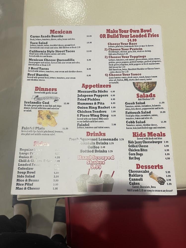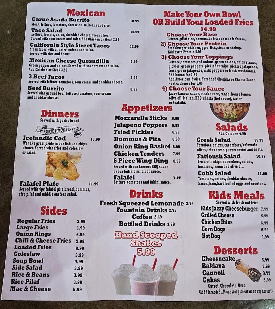 Jazzy Steakburger features a concise yet satisfying menu that showcases the best of American diner cuisine. The menu encompasses an array of burgers, including the Lil Jazzy and the Big Jazzy Steakburger. For those craving something different, the Philly Cheesesteak Sub and Chicken Philly Sub are top choices, boasting robust flavors. Additional options include the Greek Gyro Sub, which adds a Mediterranean twist to the traditional diner fare. Diners will also find sides such as crispy onion rings and seasoned fries, perfect for sharing. The average price hovers around $9.62, offering an affordable dining experience. It's a place to enjoy hearty meals that highlight comfort food at its finest.